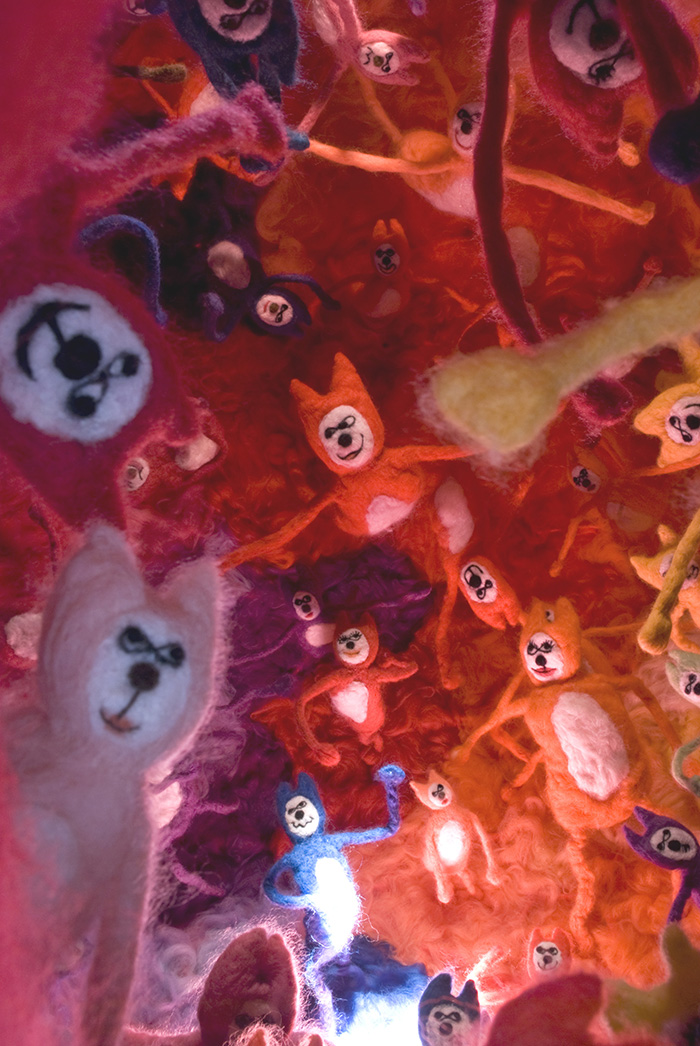SHAMOJI SHAMOJIは浄化。知らず知らずのうちに人類を救済する。人間の負の感情が好物でそれを栄養源に仲間を増やす。怒りや悲しみ、妬み嫉み、尽きることのない人間の淀んだ感情は独特の旨味があってやめられない。分裂するのもいるし、飛行船のように漂いながら大量に生成する母体もいる。 曇天のような気分がすぅっと晴れた時はSHAMOJIが食べていった後かもしれません。ごちそうさまでした。 MOTHER SHAMOJI (2016) size : H200×W170×D170cm